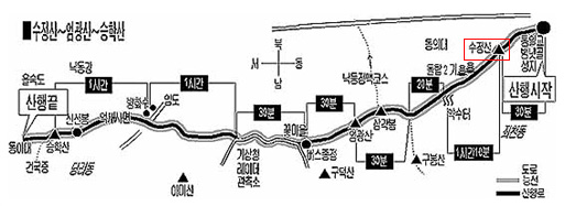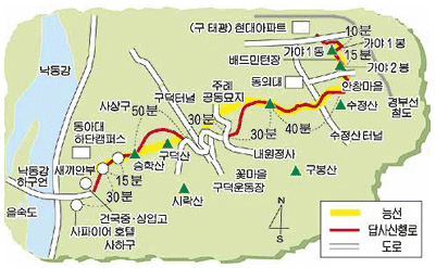 - 꽃동네-내원정사가는길-산불감시소-엄광산-삼각봉-돌탑-수정산-범내골 통일교성지(2시간30분)