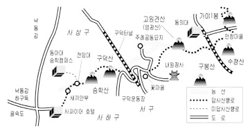 - 동아대 하단캠퍼스 학군단(사하구 하단 건국중.고등학교)-승학산-신선봉-억새지대-임도-꽃동네(2시간)